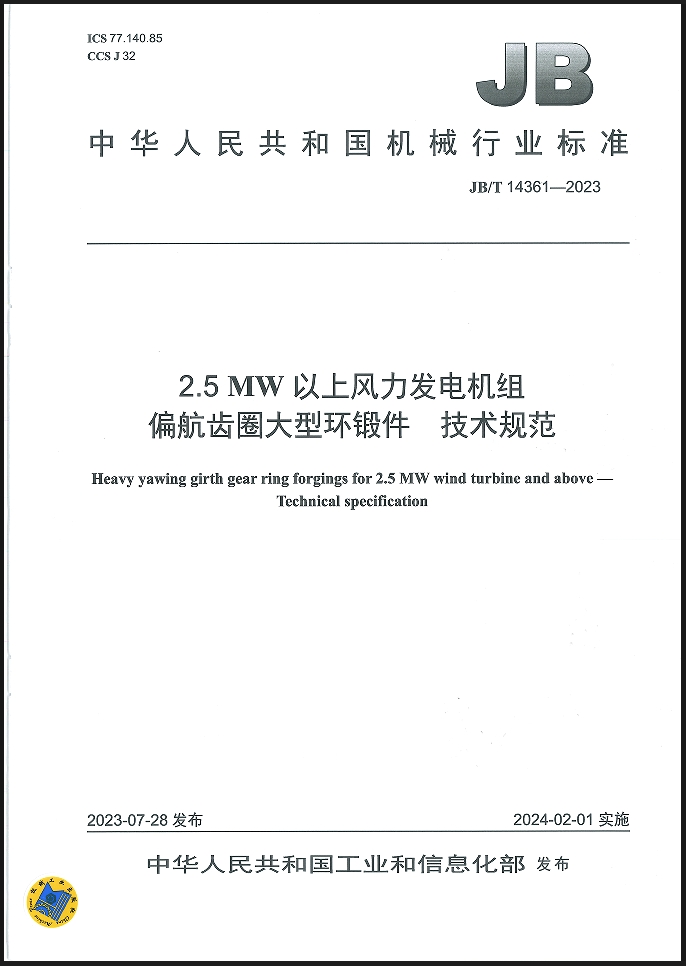 中環(huán)海陸聯(lián)合大連聯(lián)合風電軸承有限公司、江蘇大學、武漢理工大學,共同制定《2.5MW以上風力發(fā)電機組偏航齒圈大型環(huán)鍛件 技術規(guī)范》。中環(huán)海陸作為標準第一起草單位,在所有測試項目的測試方法上都進行了深入的研究,該標準于2024年2月1日實施。本標準解決了2.5MW以上風力發(fā)電機組偏航齒圈大型環(huán)鍛件的選材問題,確定了2.5MW以上風力發(fā)電機組偏航齒圈大型環(huán)鍛件的常用材料、技術指標、檢測方法和檢驗規(guī)則,填補了相關標準的空白。
